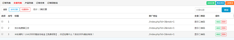 三、“文章列表”,可以無限制的發(fā)布自己想要發(fā)布的產(chǎn)品,或者宣傳文章,從“推廣地址”或者掃描“微信二維碼”可以直接進(jìn)入前臺頁面,看到自己編輯的內(nèi)容!