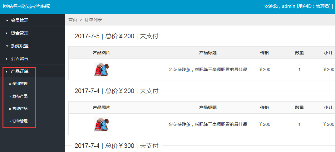 “產品訂單”,產品信息的管理,用戶下訂單的管理,統一集中,方便尋找和查看!