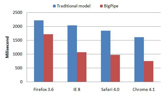 下圖是傳統模式和BigPipe性能數據比較圖,數據是75%用戶對一個頁面中最重要的內容(例如:新聞動態被認為是在Facebook主頁上最重 要的內容)的感知延遲時間。收集數據方式是加載Facebook主頁50次并且禁用瀏覽器緩存。該圖顯示BigPipe使用戶在大多數瀏覽器中感受到的延 遲減少了一半。