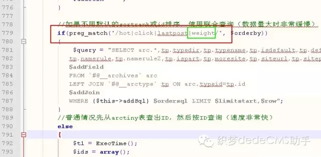 6、接著我們往下拉找到下面代碼段,加了剛才的代碼之后大概在779行左右。在lastpost后面加上weight,如下圖所示。