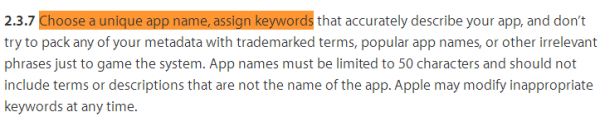 ASO副標(biāo)題不要出現(xiàn)熱門APP品牌詞,想蹭量的心情可以理解,但蘋果對(duì)副標(biāo)題的規(guī)定是有明文規(guī)范的,其中堆砌品牌詞與熱門APP的行為都將引發(fā)一系列后果。有些開(kāi)發(fā)者上架被拒的原因,就有應(yīng)用副標(biāo)題沒(méi)不過(guò)關(guān)的因素。(圖為APPStore官方規(guī)范截圖)