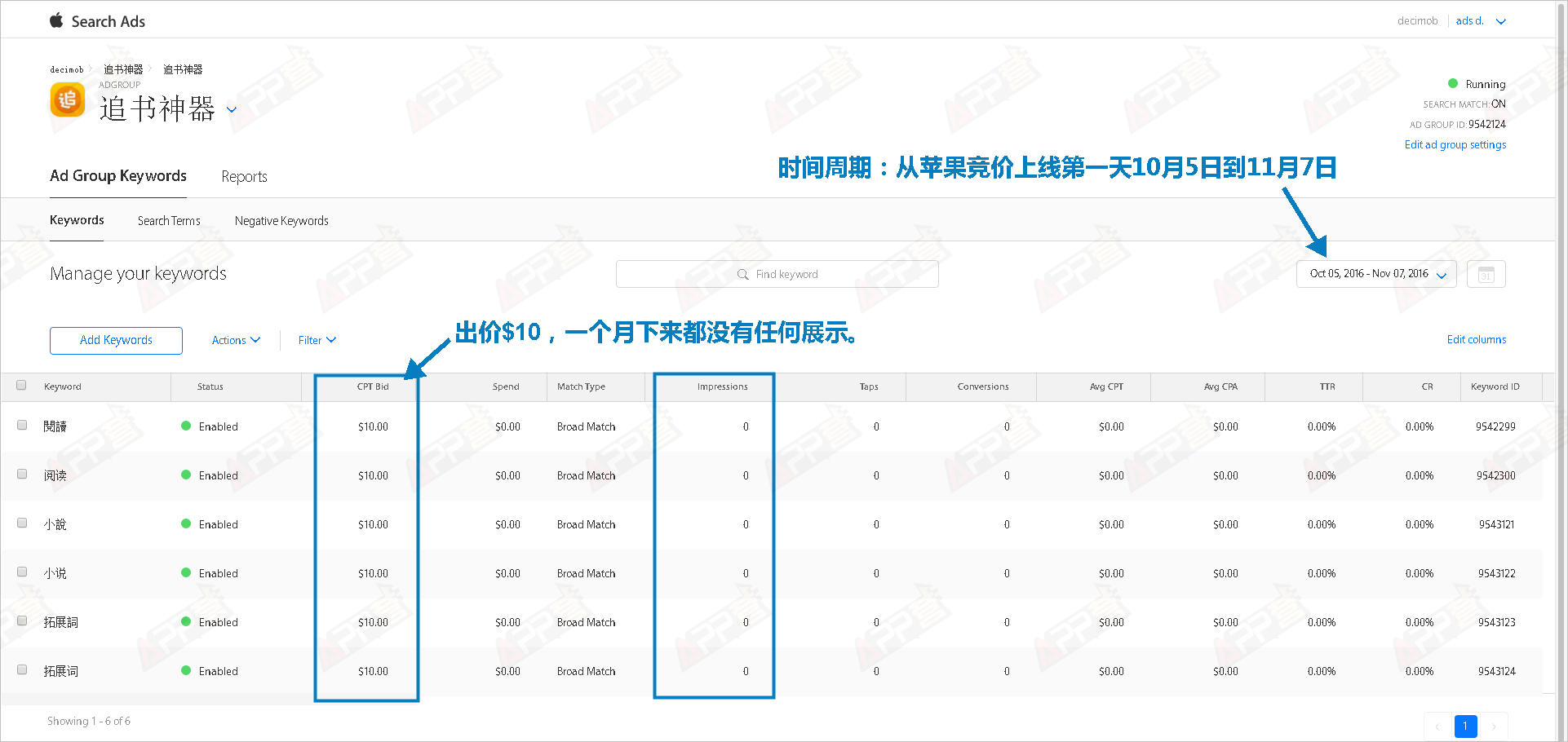 效果:在2016/10/5~2016/11/6一個月的時間內,關鍵詞出價逐步提升到 $10 依然沒有任何展示數據。同時所有投放的關鍵詞沒有出現任何廣告。